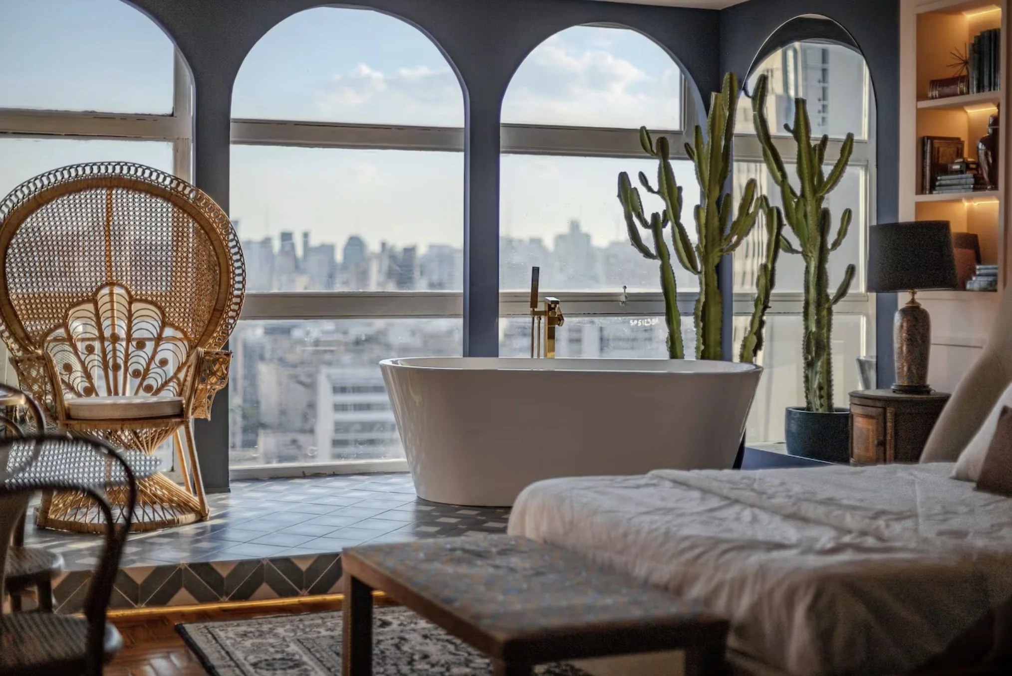 Apaixone-se pela vista deslumbrante do 37º andar deste apartamento único em São Paulo. Em um dos edifícios mais históricos da cidade, o imóvel oferece um ambiente charmoso e sofisticado, com uma banheira ao lado da janela, persianas automatizadas para uma experiência INCRIVEL. O estilo inspirado em Marrakech, com tons de azul e rosa, cria um refúgio perfeito para quem busca conforto e beleza em um só lugar.